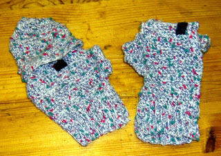 I’m really pleased about this, as I’ve just finished another couple of bits for her – a pair of mittens that convert to fingerless, so that Brex can text without having to take her gloves off, but keep her fingers warm otherwise. I made them with a colour-flecked, cotton-rich, yarn, and I used a small square of Velcro to keep the flap closed when she wears them. I also made another pair of leggings, made with the emerald green 100% acrylic wool that I like to use:)