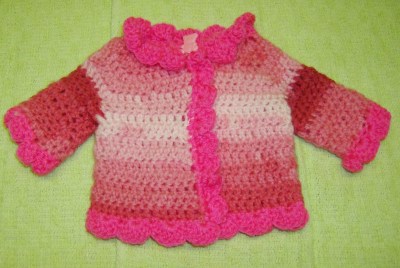 I used a cute pink plastic teddy button to fasten it at the collar, and I added the shell pattern to edge it, as the actual pattern was very plain. The collar wasn’t from the pattern, either.