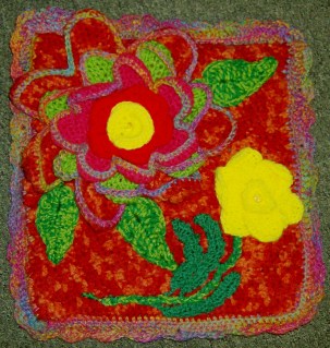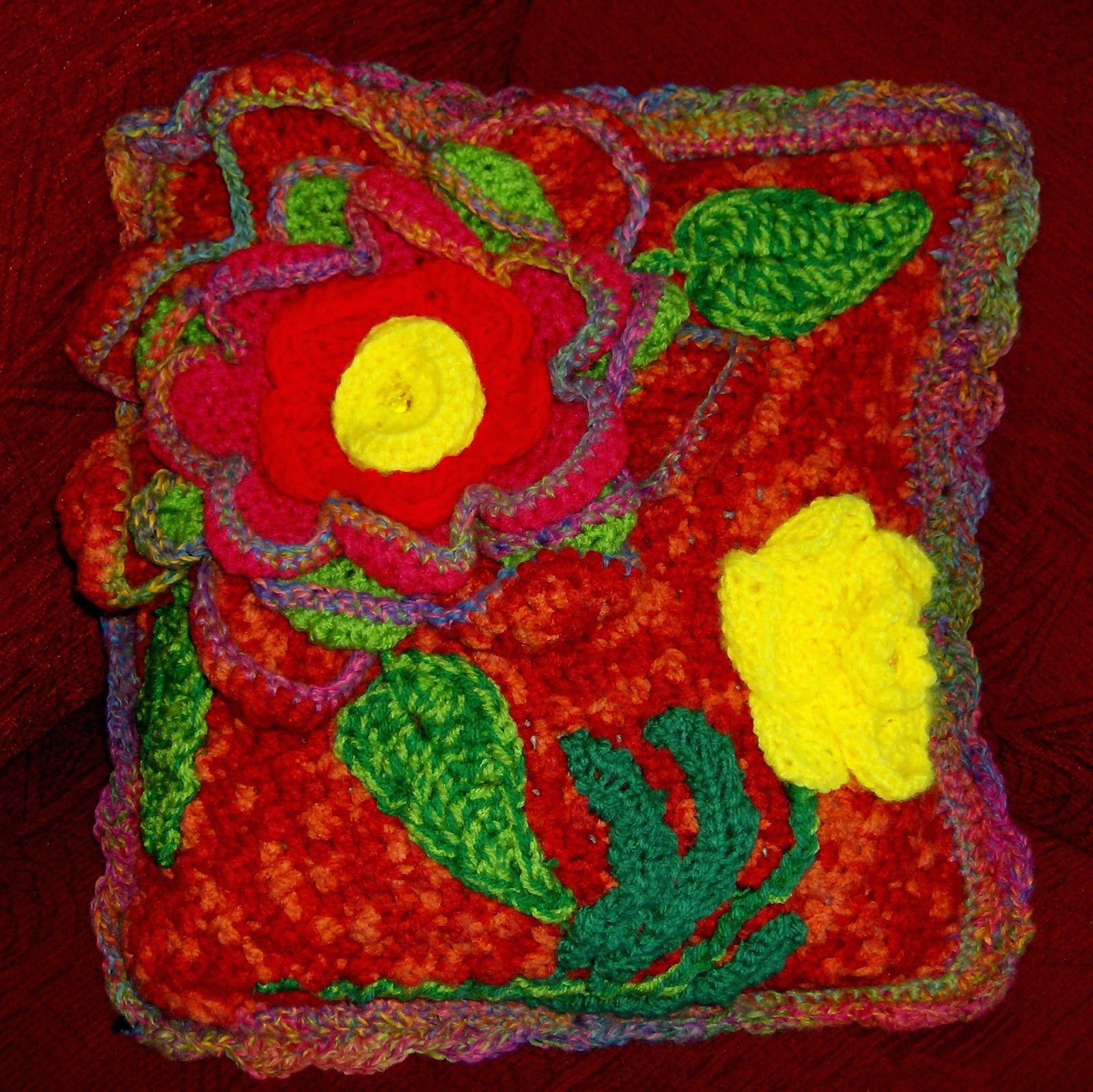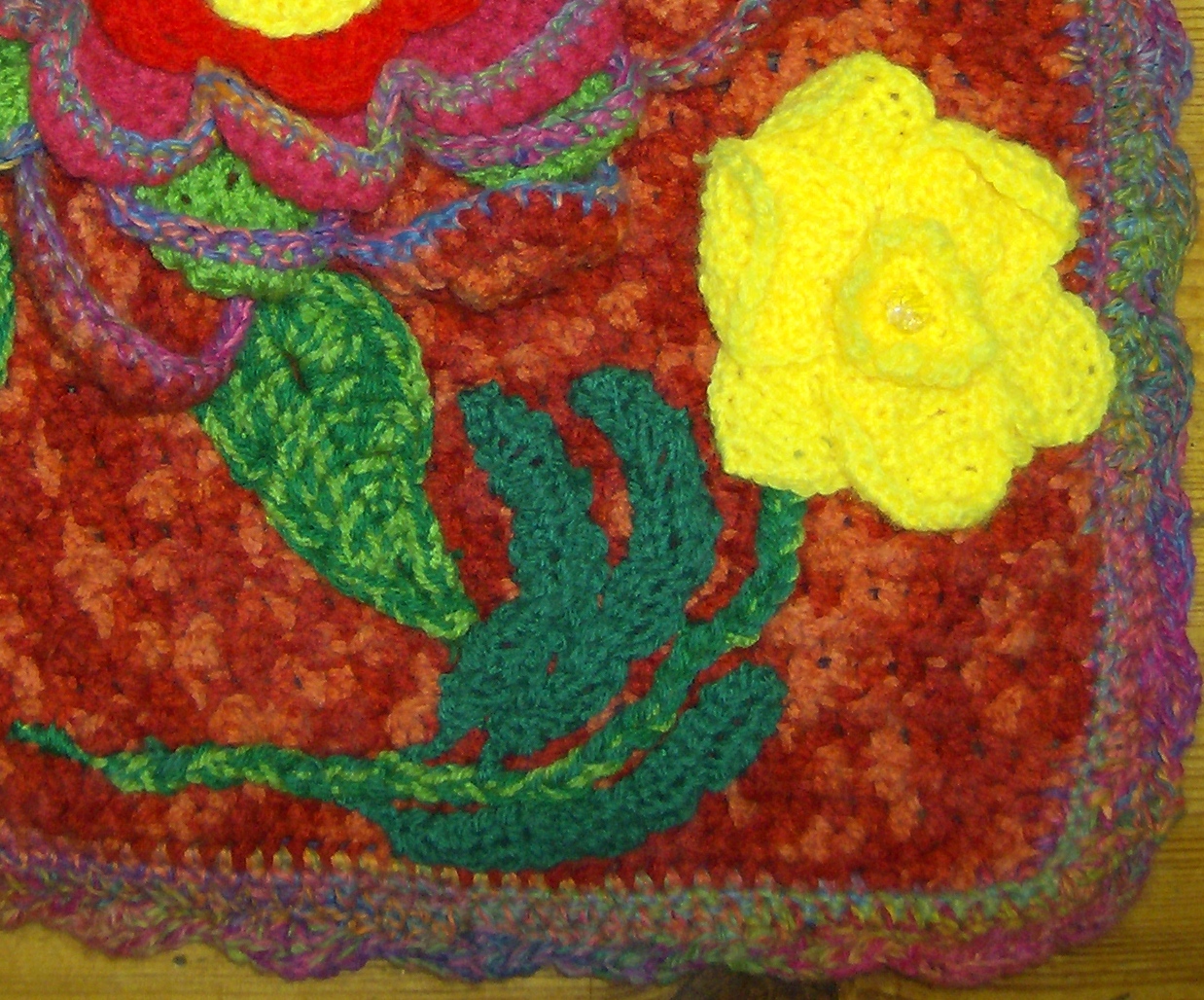 For the main front, I used Red Heart Chunky – Fire – and, for the flowers and leaves I used up the last of my various Red Heart Sport colours. For the back, and the edging of the petals – plus the cushion edging itself – I used Red Heart Curly Q – Calypso – which, admittedly, wasn’t the most obvious choice, but I liked the springiness of it, and the way it caused the petals to curve inwards.
