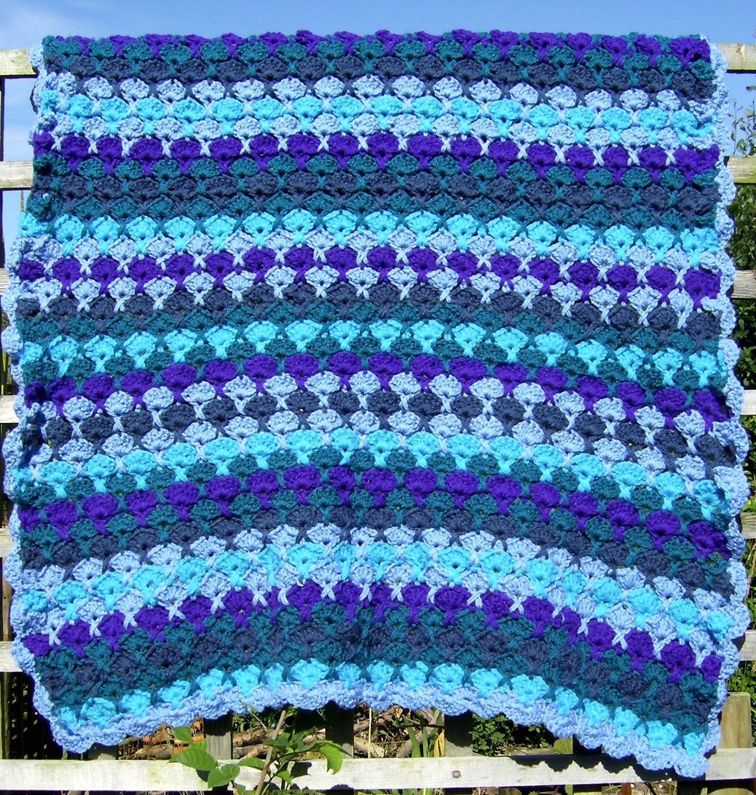 Well, I’ve finished making the blanket, and I’ve crocheted all the Dolphin Appliqués – I’ve made 4 small, and 4 medium, ones. I looked all over the internet for a larger appliqué to put centrally on the blanket, but couldn’t find one anywhere, and so I used the Three JQ Designs pattern, and re-created a much larger version – after much frogging and restarting! 🙂