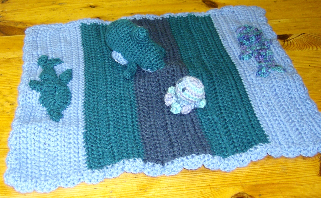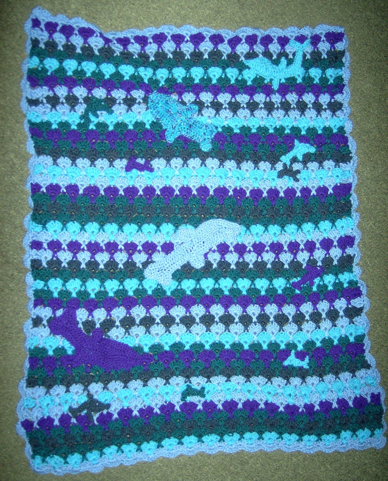 With a few modifications of the pattern, I crocheted the blanket, hoping that it would look a little like a tropical sea, and I think it turned out OK. I also added some Dolphin appliqués, to go with that theme and, although they didn’t turn out quite as I’d hoped, I think I didn’t do too badly for someone who’s never done any of this before: