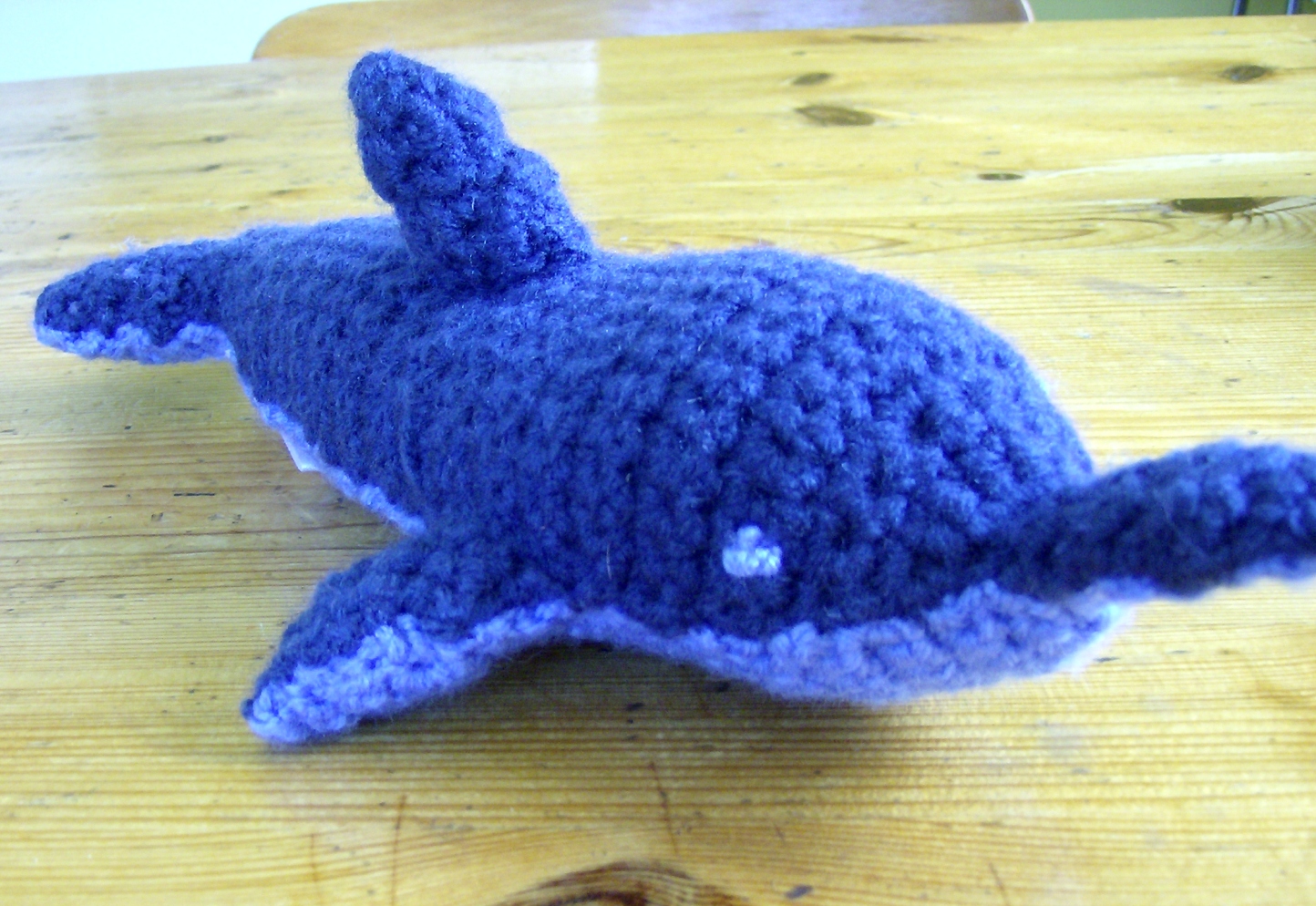 As Dolphins were the theme of the day, I also made a dolphin toy for Jo’s baby, crocheted in the same colours as the blanket, and made as child-friendly as is possible: