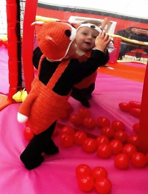 And here’s a lovely picture of one of Harry’s best friends, wearing the Bee outfit – can you see the sting I made? Lol